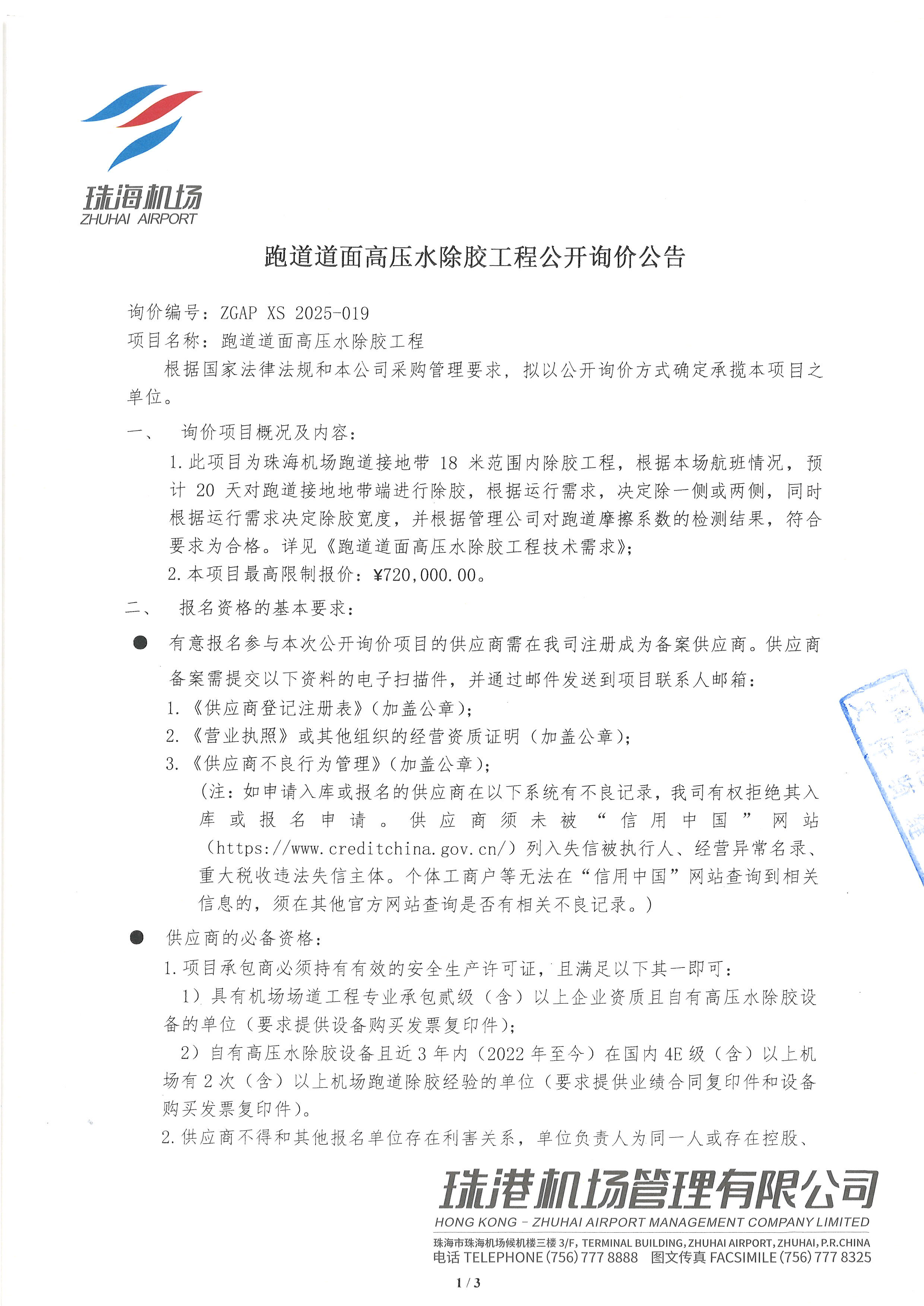跑道道面高壓水除膠工程公開詢價公告
