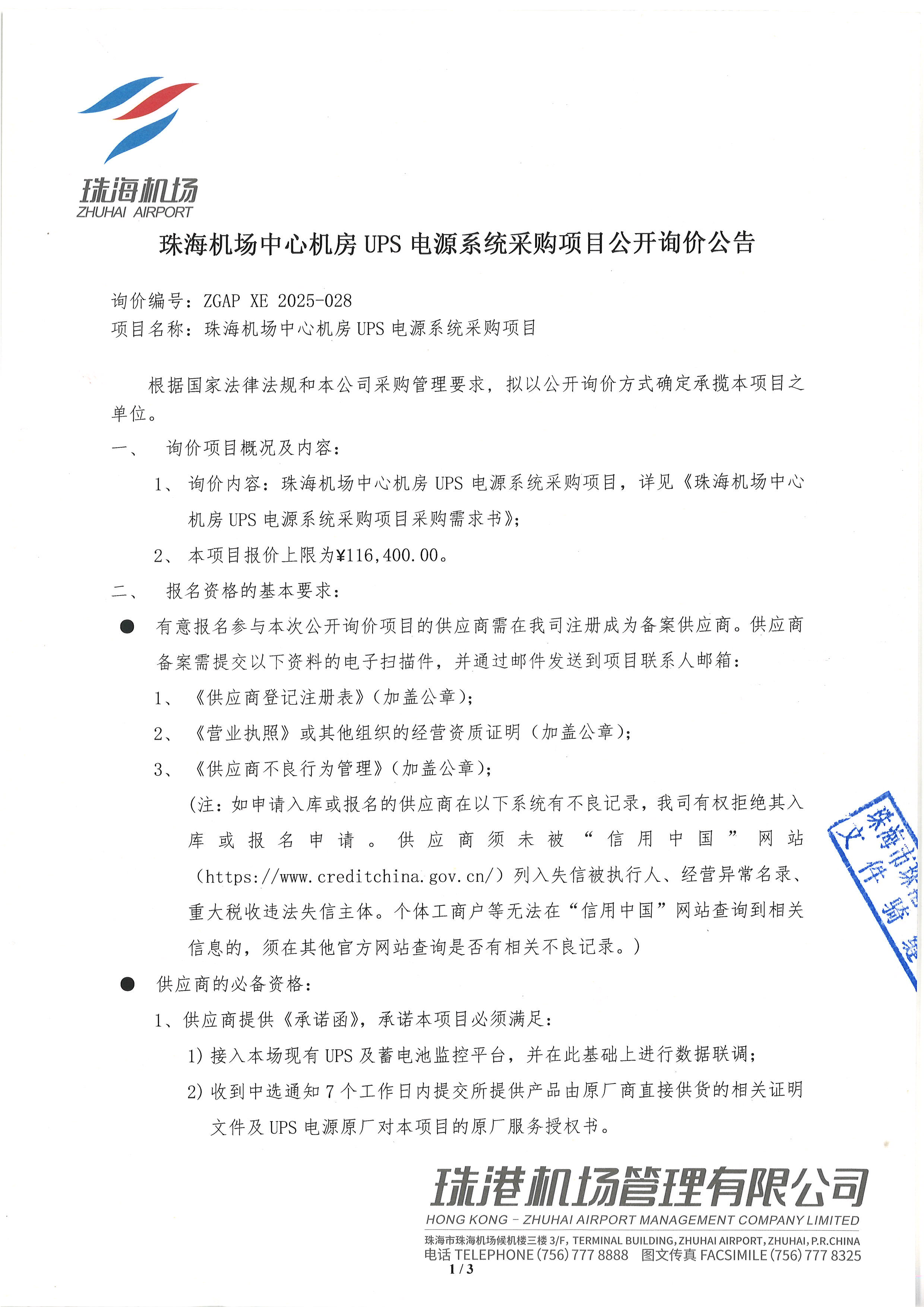 《珠海機場中心機房UPS電源系統(tǒng)采購需求書》;